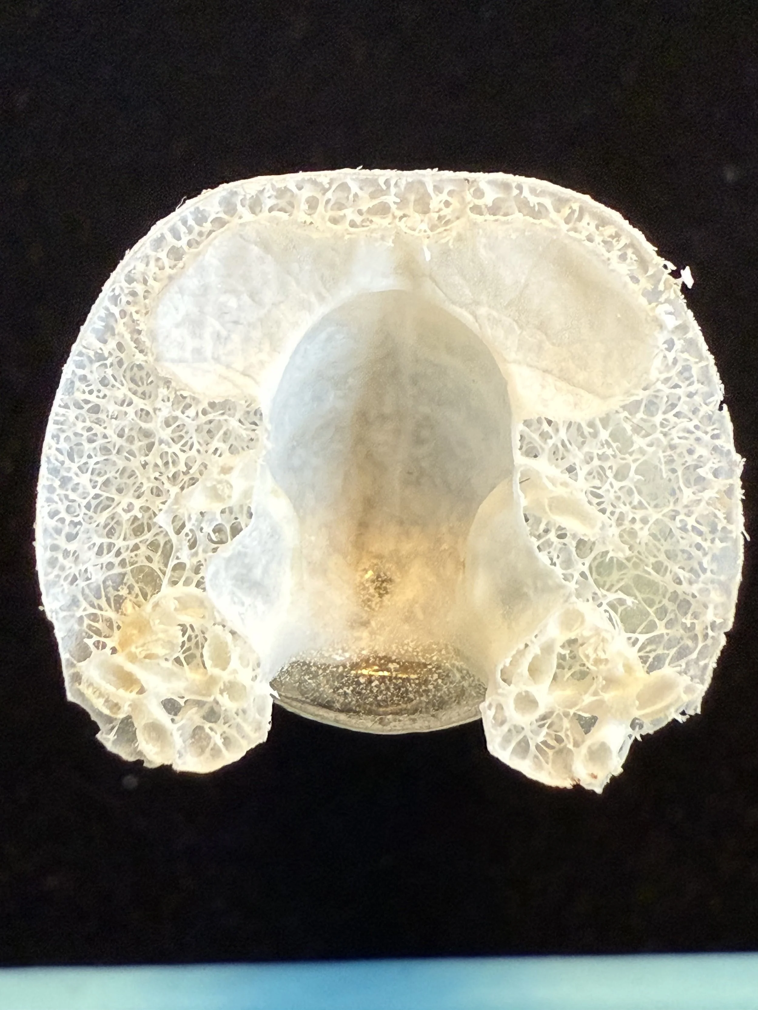 Cross-section of a pigeon skull, showing its lightweight, foam-like interior from Specimen CFS3907 Concord Field Station, Harvard University.